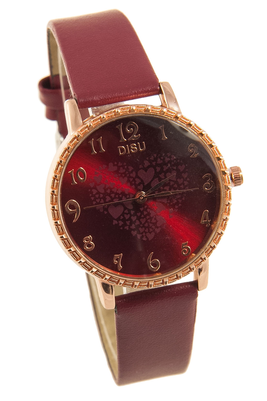 Elegancki zegarek o złotym wykończeniu. Paski zagarka są w kolorze bordowym.