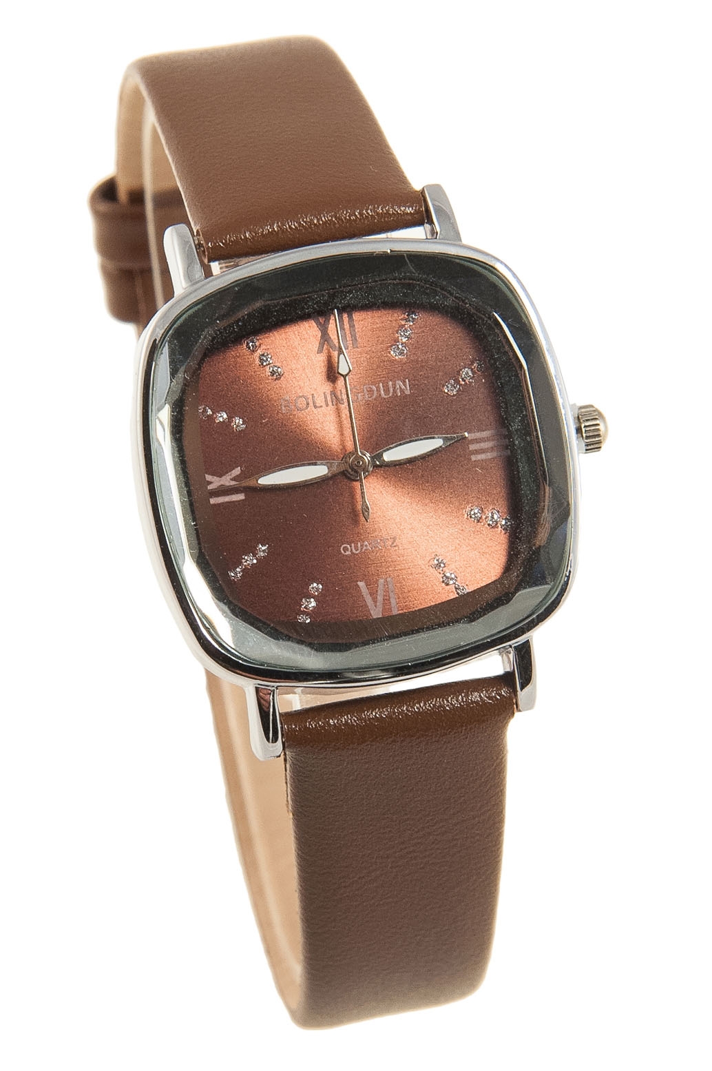 Elegancki zegarek o srebrnym wykończeniu. Pasek zegarka jest w kolorze brązowym.