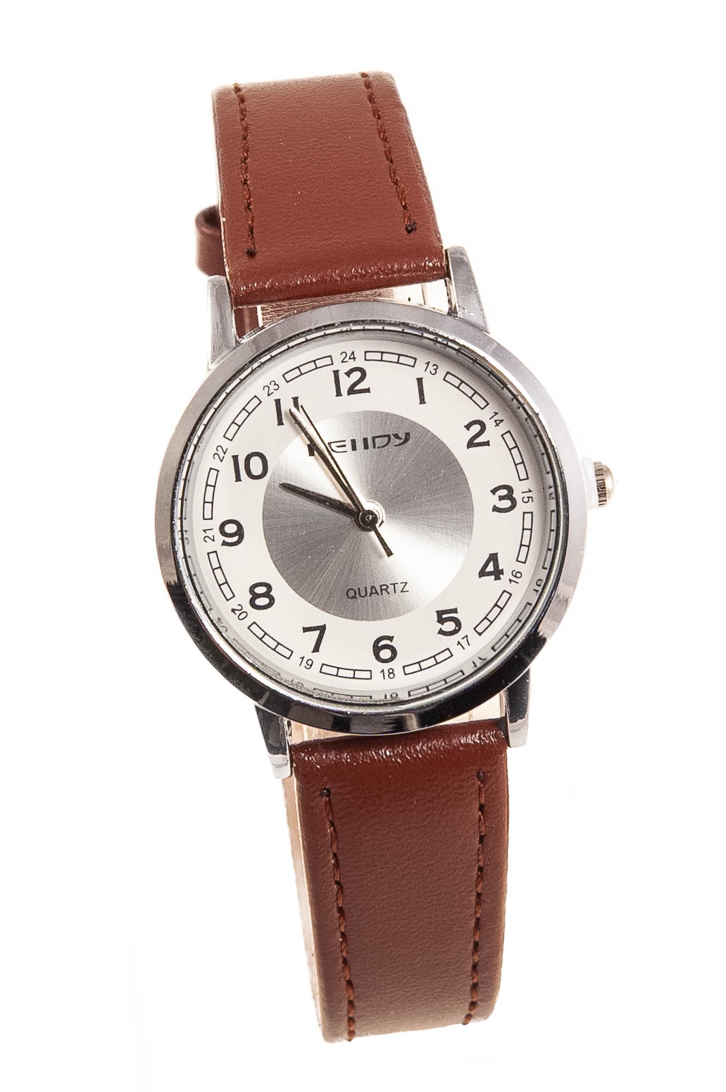 Elegancki zegarek o srebrnym wykończeniu z brązowym paskiem.Wymiary zegarka: