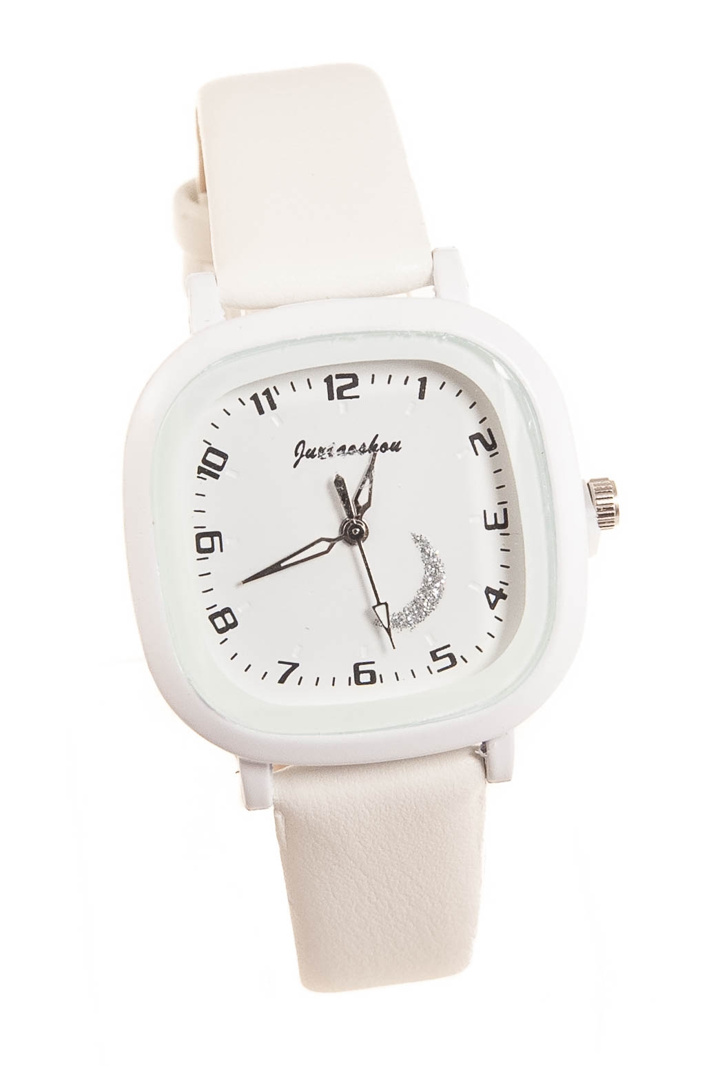 Elegancki zegarek o srebrnym wykończeniu z biaym paskiem.