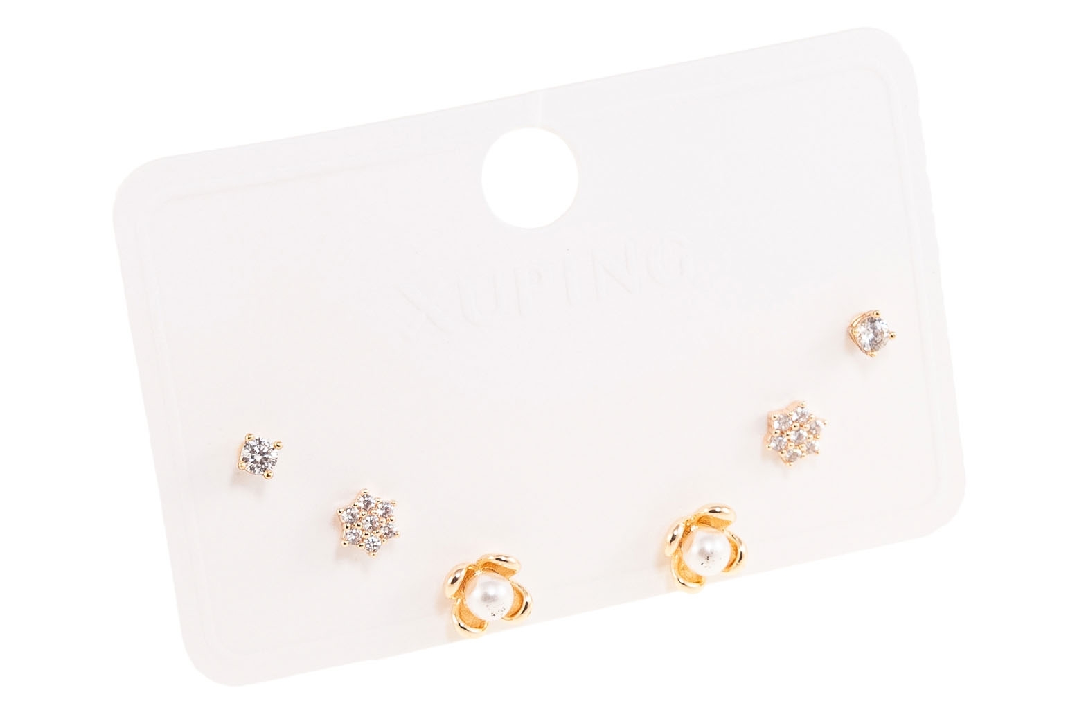 Zestaw trzech delikatnych kolczyków. Kolczyki w kolorze złotym, ozdobione są perełkami i szlifowanymi kamieniami.Wymiary kolczyków: