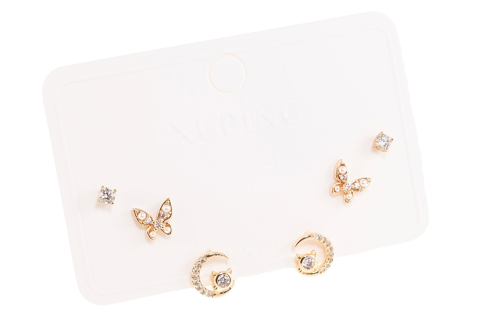 Zestaw trzech delikatnych kolczyków. Kolczyki w kolorze złotym, ozdobione są perełkami i szlifowanymi kamieniami.