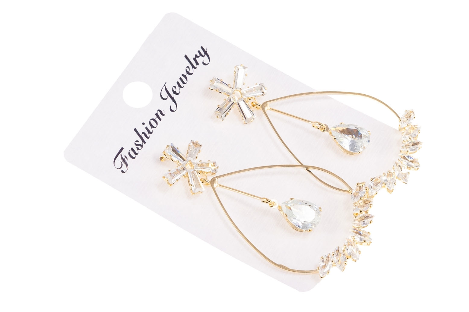 Modne w tym sezonie kolczyki.Długie kolczyki w kolorze złotym, ozdobione są pięknie mieniącymi się kamieniami.
