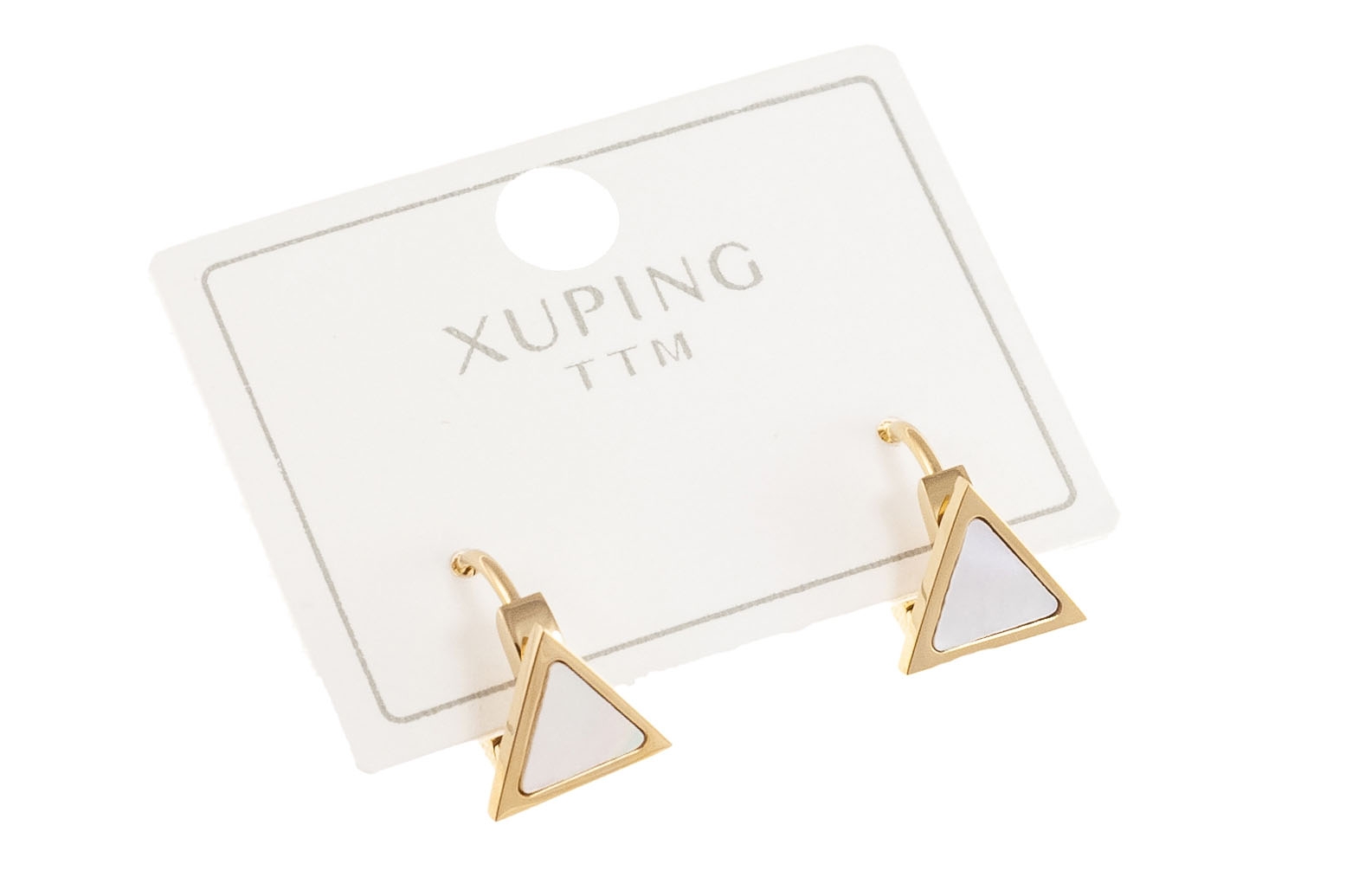 Eleganckie, złote kolczyki z białymi trójkątami.